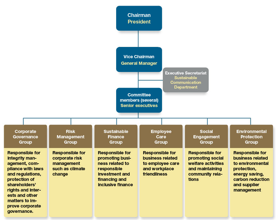 Article 1 In order to improve the overall practice of sustainable development and to integrate relevant plans and resources for proper allocation, the Sustainable Development Committee (hereinafter referred to as the Committee) is hereby established in accordance with the Sustainable Development Best Practice Principles for TWSE/TPEx Listed Companies. Article 2 The duties of the Committee are as follows: Approval of annual targets for sustainable development. Approval or review of implementation plans on sustainable development. Tracking and review of sustainable development execution and implementation results. Approval of the preparation of the sustainability report. Approval or review of other matters related to sustainable development. Article 3 In the Committee, the President serves as the Chairman, the General Manager serves as the Vice Chairman, and relevant senior executives appointed by the President serves as the committee members. In addition, executive groups are set up according to the business, and relevant department leaders appointed by the President serve as the group leaders. The division of authority and responsibility and their duties of each group are as follows: Corporate Governance Group: Secretary’s Office of the board of directors, Auditing Office, Legal Compliance Office Responsible for the protection of shareholders’ rights and interests, integrity management, compliance with laws and regulations and other matters to improve corporate governance. Risk Management Group: Risk Management Department Responsible for corporate risk management such as climate change. Sustainable Finance Group: Strategic Planning Department Responsible for promoting business related to responsible investment and financing and inclusive finance. Employee Care Group: Human Resources Department Responsible for business related to employee care and workplace friendliness. Social Engagement Group: Sustainable Development and Corporate Communication Department Responsible for promoting social welfare activities and maintaining community relations. Environmental Protection Group: Asset Management Department Responsible for business related to environmental protection, energy saving, carbon reduction and supplier management. Article 4 In the Committee, the Chairman shall call up the Vice chairmen and committee members to hold regular meetings (at least once a year). Meetings may be convened at any time if necessary. At each meeting, committee members and group members could be invited by the Chairman to attend according to the content of the agenda. The relevant personnel may be informed to attend the meeting as non-voting participants and make statements or replies on relevant matters. Article 5 The Chairman of the Committee is the ex officio President of the meeting. When the Chairman is unable to attend the meeting for any reason, the Vice Chairman shall act as the Chairman. Article 6 The Committee’s Agenda Working Unit is the Sustainable Communication Department, which is responsible for assisting the Committee in convening meetings. Article 7 If the relevant personnel of the Committee know, obtain or hold any confidential information of the Company due to their duties, they shall be obliged to keep it confidential. Article 8 The resolutions of the Committee shall be implemented by the relevant units in accordance with their functions and powers. Article 9 The Organizational Regulations shall be implemented after approval by the President. Any revision of it shall follow the same procedures of approval. Organizational Structure of the Sustainable Development Committee of Infinite Finance Co., Ltd. Return to the list