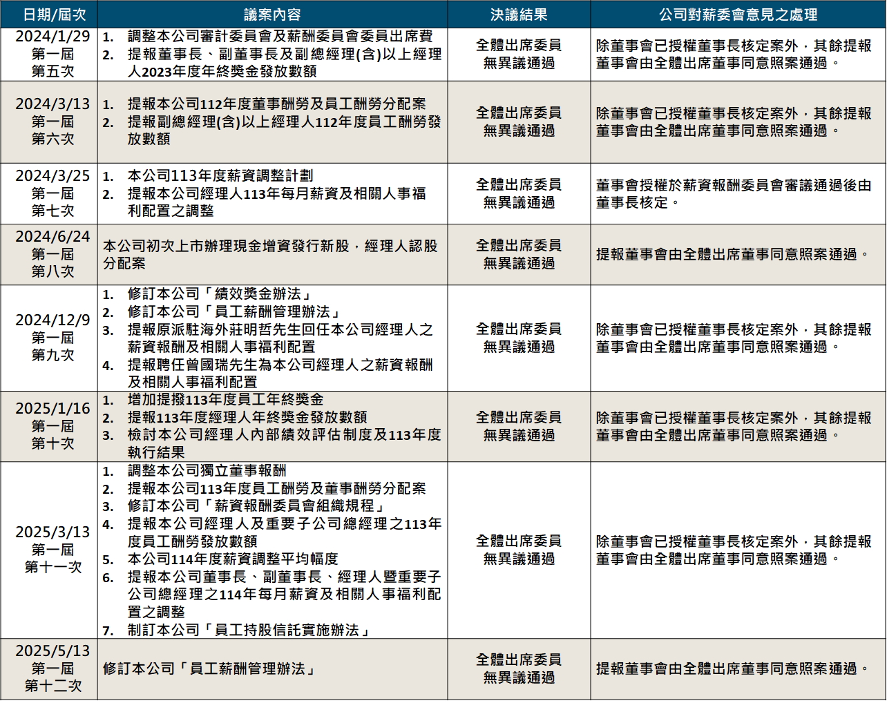一、為強化公司治理,本公司自2023年5月起設有薪資報酬委員會,至少每年召開二次會議,其成員由全體獨立董事組成,職權事項及成員如下: