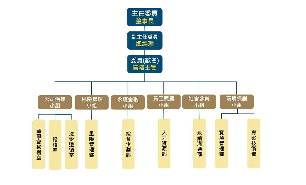 公司董事會於2023年4月通過《永續發展實務守則》,作為推動永續發展的指導方針。同月,正式設立永續發展委員會,統籌公司整體永續發展工作。委員會由董事長擔任主任委員,總經理擔任副主任委員,並由董事長指派相關高階主管擔任委員;另依業務性質設立執行小組,由董事長指定部級主管擔任組長,永續溝通部則擔任執行秘書,負責協調與執行相關事項。